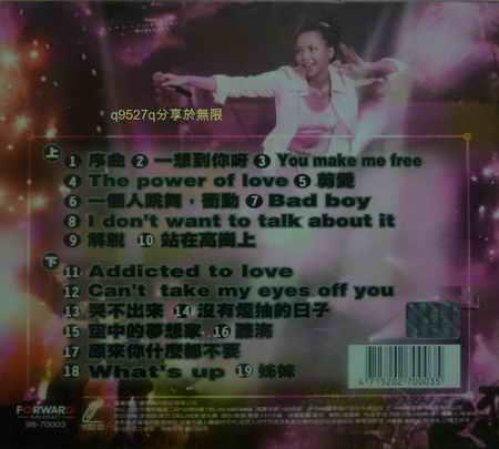 張惠妹-妹力四射LIVE演唱會(張惠妹1998第一場演唱會 最乾淨的聲音 最自然散發的舞台"妹"力)(CD2片裝) -=-=-=-=-=-=-=-=-=-=-=-=-=-=-=-=-=-=-=-=-=-=-=-=-=-=-=-=-=-=-=-=-=-=-=-= 軟體名稱:張惠妹-妹力四射LIVE演唱會(張惠妹1998第一場演唱會 最乾淨的聲音 最自然散發的舞台"妹"力)(CD2片裝) 語系版本:音樂無國界 光碟片數:2片裝 破解說明: 系統支援:WIN 9x/WIN ME/WIN NT/WIN 2000/WIN XP/WIN 2003 軟體類型:KTV,MTV卡拉OK,歌劇 硬體需求:PC 更新日期:2009/5/31 官方網站: 中文網站: 軟體簡介: 銷售價格:160 -=-=-=-=-=-=-=-=-=-=-=-=-=-=-=-=-=-=-=-=-=-=-=-=-=-=-=-=-=-=-=-=-=-=-=-= 軟體簡介: 張惠妹-妹力四射LIVE演唱會(張惠妹1998第一場演唱會,最乾淨的聲音,最自然散發的舞台"妹"力)(2CD) 曲目: [上] 1.序曲 2.一想到你呀 3.You Make Me Free 4.The power of love 5.剪愛 6.一個人跳舞,衝動 7.Bad boy 8.I don't want to talk about it 9.解脫 10.站在高崗上下 [下] 11.Addicted to love 12.Can't take my eyes off you 13.哭不出來 14.沒有煙抽的日子 15.空中的夢想家 16.聽海 17.原來你什麼都不要 18.What's up 19.姊姊 -=-=-=-=-=-=-=-=-=-=-=-=-=-=-=-=-=-=-=-=-=-=-=-=-=-=-=-=-=-=-=-=-=-=-=-=
